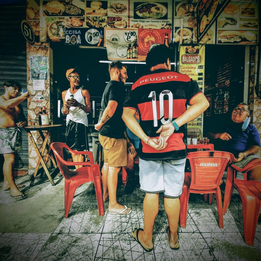 They even taught me how to play Porrinha, an extraordinarily animated and fun game with only three coins. Each player starts with three coins that they hold hidden in one hand. You decide how many coins you want to keep hidden in your hand in front of you, between 0 and 3. All the players stretch out their hands, not showing how many coins they have in their hand, and then they must guess the total number of coins there are among all the players.