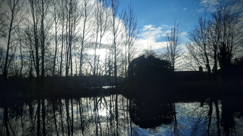Wordsley, Stourbridge: 8 degrees, and with a beautiful blue sky, but with the threat of rain.