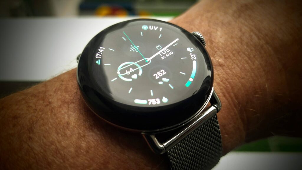 Besides being a watch and telling time, the Google Watch is a smart watch, so it has features I can use to help me with my daily routine, such as synchronising with my mobile phone and seeing which emails or messages are most important to attend to. It also confirms payments and, most importantly for me, it has a pedometer to track my steps, which for the last three or four years has been a minimum of 10,000 steps every day.