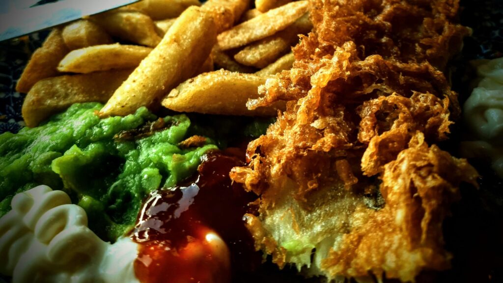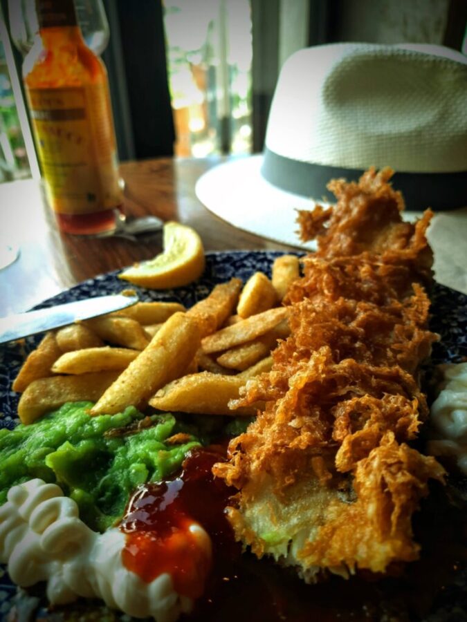When we entered, I was impressed by how busy the place was. A female waitress greeted us and showed us to a table for two. We ordered. I chose fish and chips, and Julie ordered a steak. The food arrived and was quite decent; we also ordered two desserts to share.